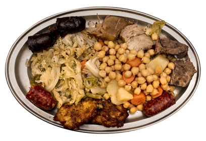 7) Cuela el cocido, emplata y con el caldo haz una sopa con fideos, que se comerá como primer plato. A continuación, la fuente con los garbanzos, las verduras y las carnes que serán el segundo plato.