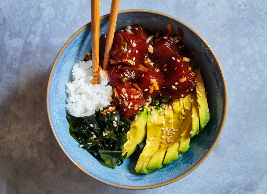 El Poke se come en boles, estos tienen una base de arroz o quínoa, sobre la cual se agrega pescado crudo marinado, acompañado por una gran variedad de ingredientes frescos como: algas, pepino, aguacate, zanahorias y muchos más.