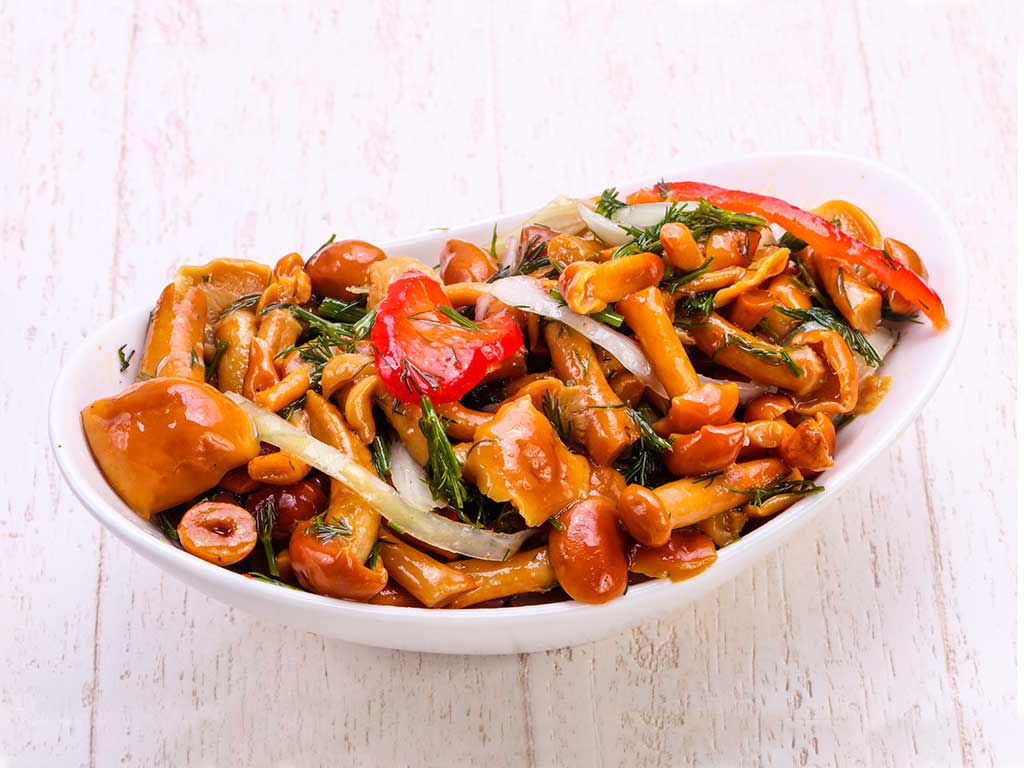 4) Después, vertemos la vinagreta por encima de los champiñones y lo mezclamos todo bien.
