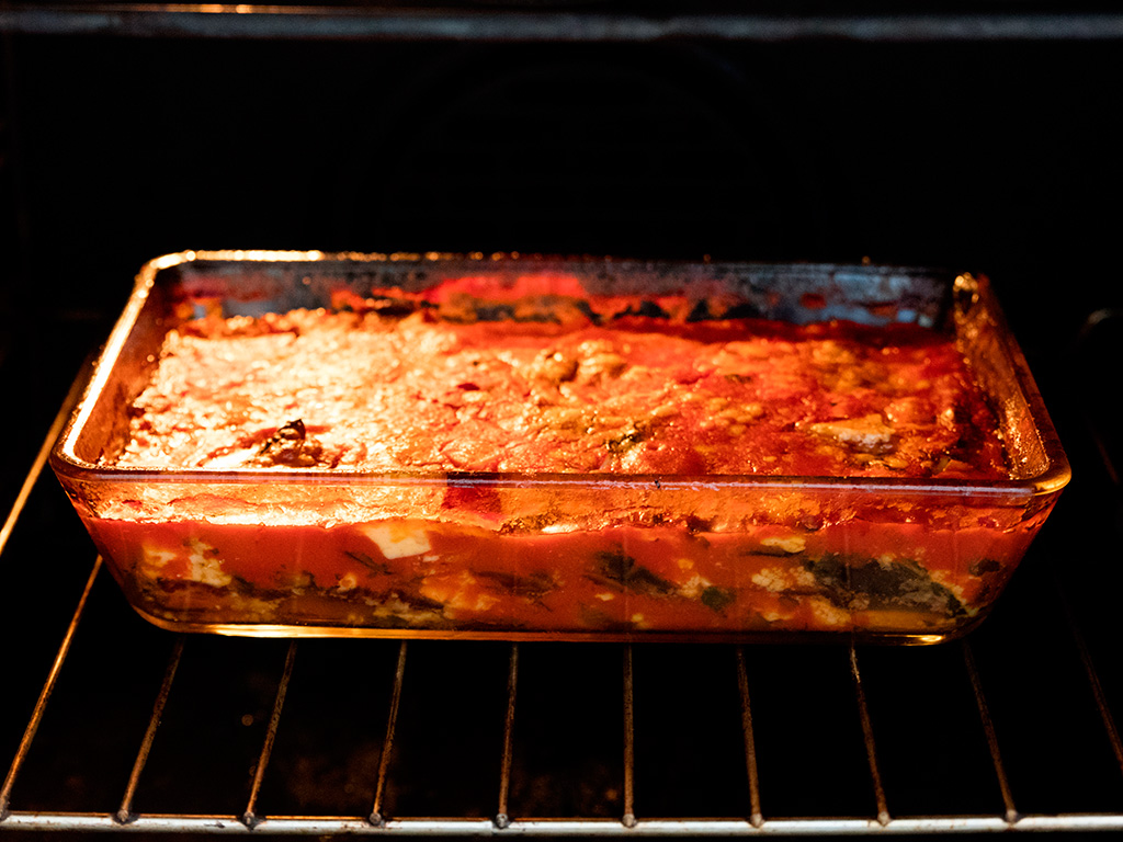 6) Precalienta el horno a 180ºC y coloca en el la pirófila con las berenjenas, déjala hornear unos 20-25 minutos. Pasado ese tiempo saca la pirófila del horno y deja enfriar unos minutos.