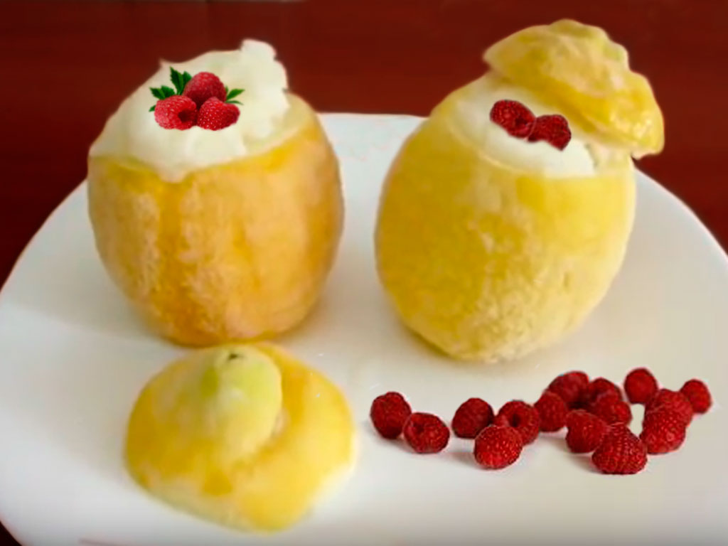 8) Ha llegado el momento de rellenar los limones, para ello sácalos del congelador y con la ayuda de la manga pastelera o de la bolsa de congelar a la que le habrás cortado el pico de una esquina, rellénalos hasta arriba y un poco más, luego cúbrelos cada uno con un sombrero. Coloca nuevamente los limones en el congelador de pies y congela por lo menos dos horas antes de consumirlos.