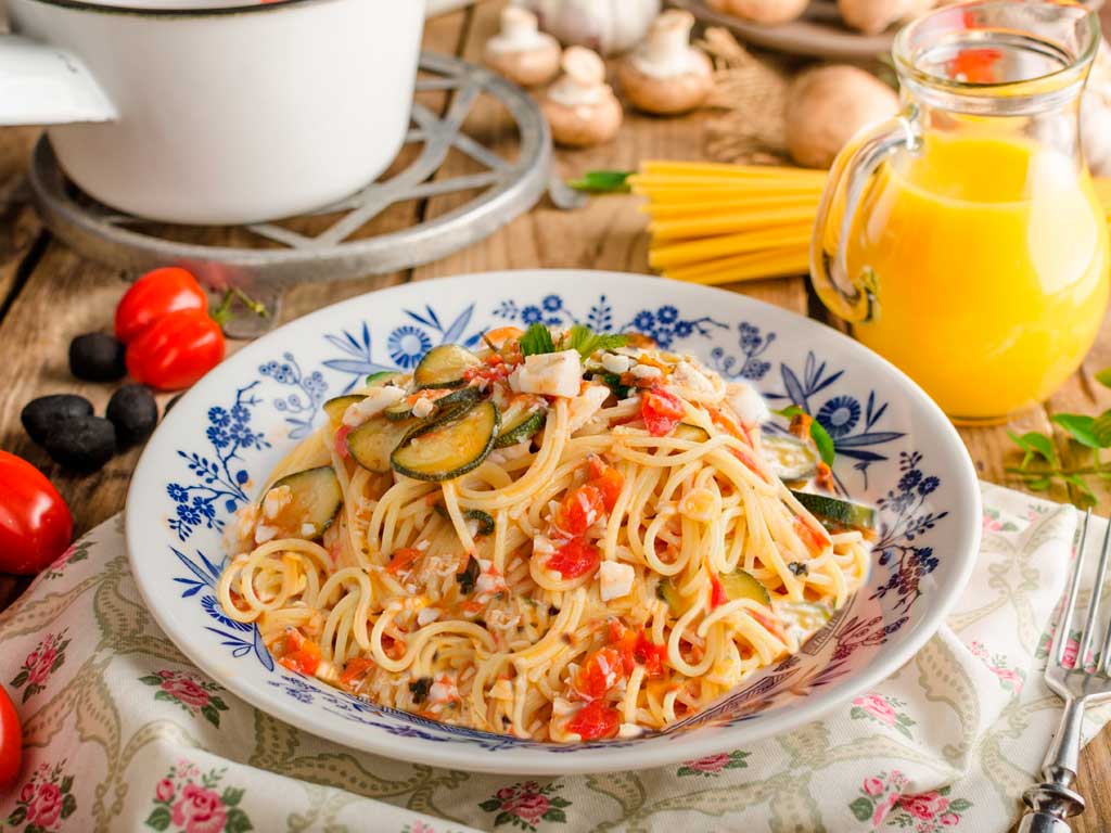 6) Mezcla muy bien un poco de salsa de calabacines con la pasta y la menta finamente picada. Emplata y reparte encima de cada plato el resto de la salsa de calabacines con lubina.