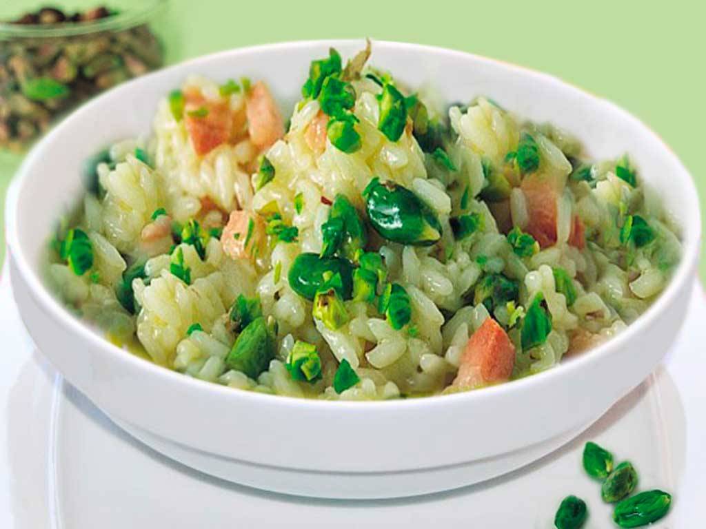 6) Cuando esté en su punto el arroz añade la panceta (sin calado) y la mantequilla, mezcla y tapa unos minutos. Pasado ese tiempo agrega los pistachos triturados, el cebollino, mezcla muy bien el todo y sirve caliente.