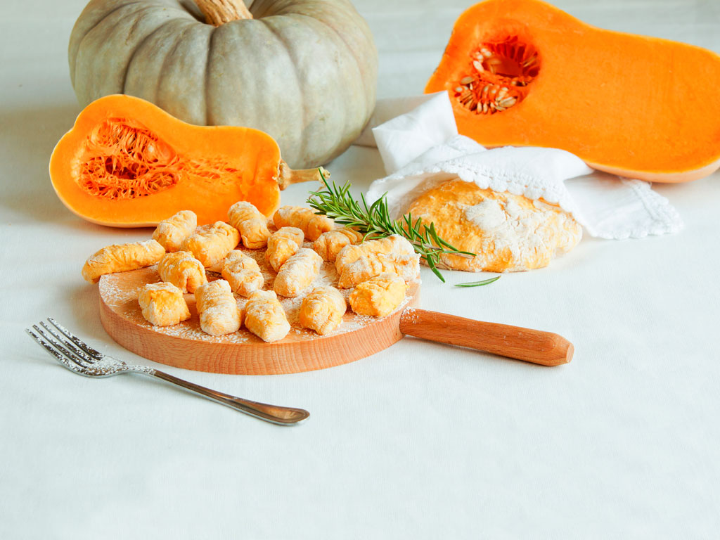 5) Prepara una bandeja espolvoreada con harina. Con las manos húmedas, coge un poco de la masa y dale la forma de ñoquis. Colócalo en la bandeja y repite esta operación hasta que se agote la masa.