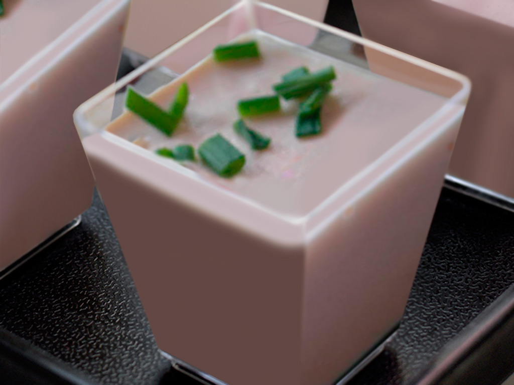 6) Prueba y rectifica la sal si fuera necesario, ya que el salmón es bastante sabroso, reparte la panna cotta con salmón en vasos individuales, los tapamos y lo guardamos en la nevera al menos 4 horas hasta el momento de servir, que lo adornaremos con un poco de cebollino por encima.