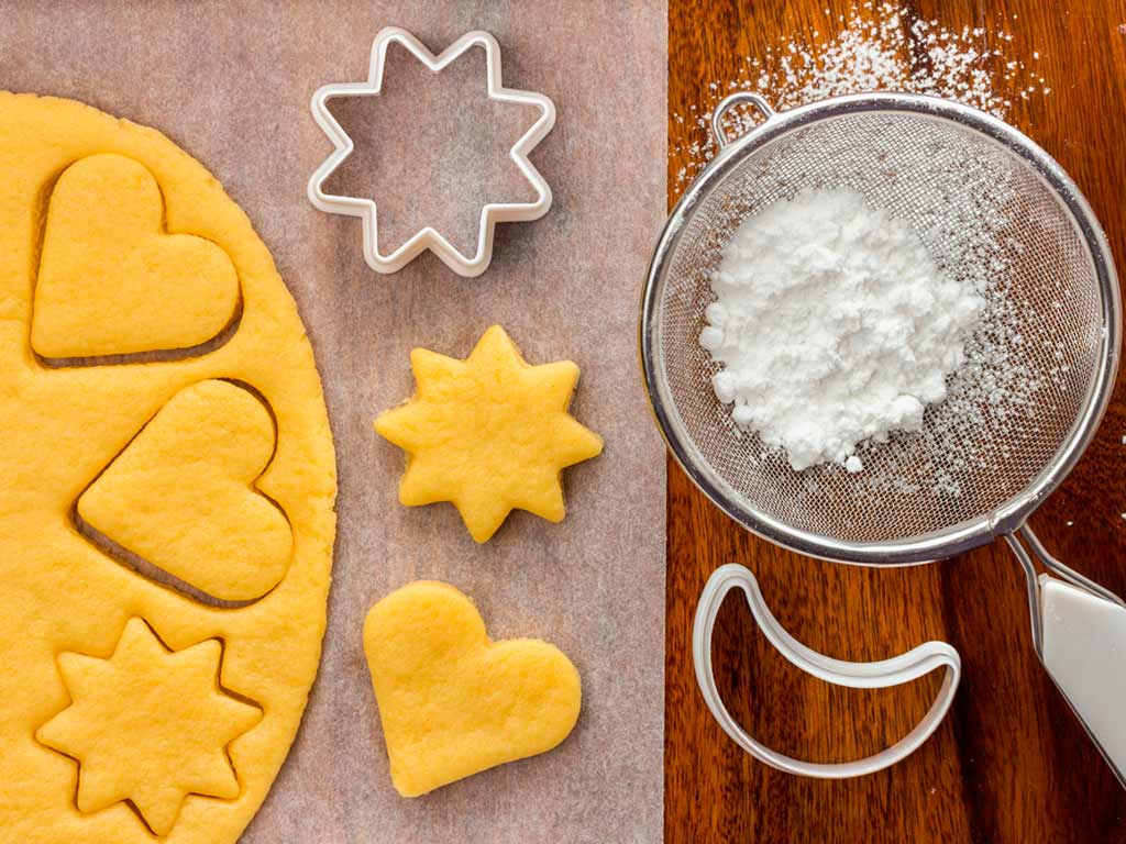 3) Pasada la media hora, saca de la nevera la masa espolvorea un poco de harina encima de la encimera y con un rodillo alisa la masa hasta que tenga un grosor de 5mm. A este punto utiliza unos cortapastas para dar forma a tus galletas o dale forma cortando la masa con un cuchillo.