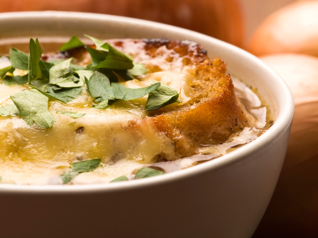 5) En unas tazas grandes para sopa (resistentes al calor) coloca la rebanada de pan en el fondo y vierte por encima la sopa que has preparado anteriormente, espolvorea con el queso gruyere rallado.