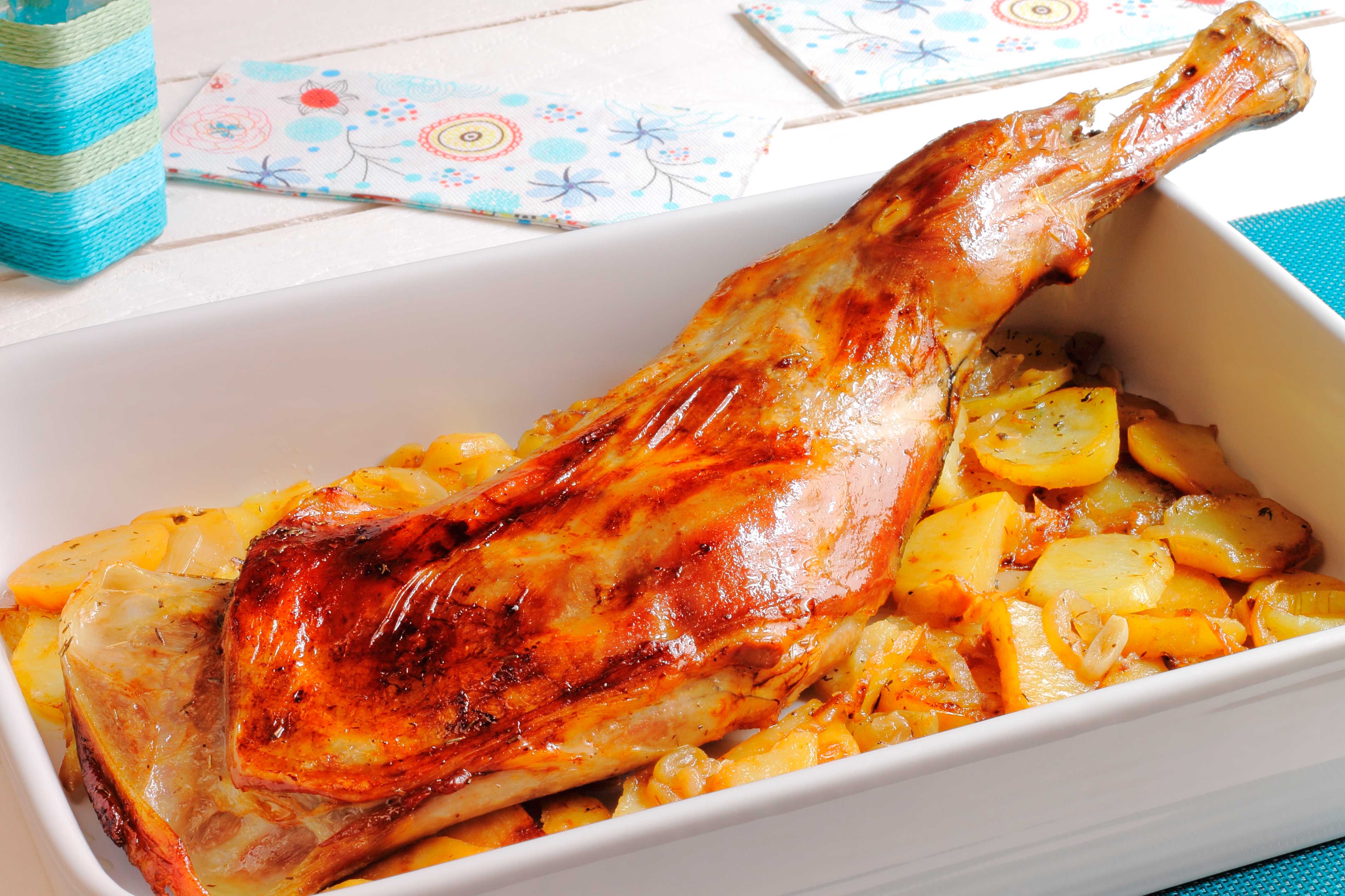 4) Precalienta el horno a 180ºC e introduce la bandeja con las paletillas durante unos 20 minutos. Pasado ese tiempo dale la vuelta a las paletillas vierte por encima de ellas el coñac y al horno otra vez, espera que estén doradas y listas.