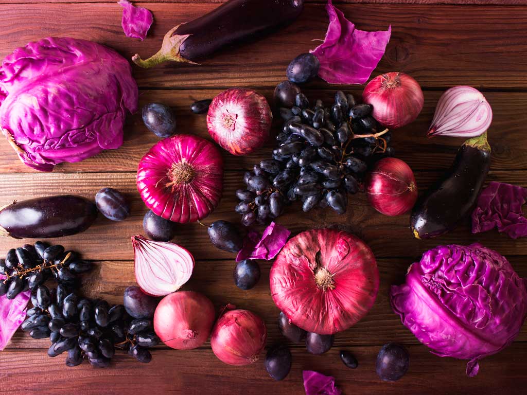Las verduras moradas son ricas en carotenoides y polifenoles, estas propiedades rinden a las verduras moradas tipo, berenjenas o repollos perfectos agentes antioxidantes, esto confiere a estos tipos de verduras la capacidad de retrasar el envejecimiento, consiguen acabar con los radicales libres, son ricas en vitamina C y aporta minerales saludables como el magnesio o el potasio.