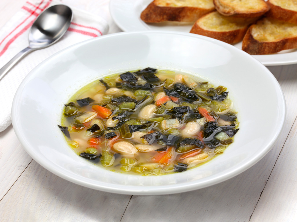 2) Limpia el repollo quitándole la parte duras de las ramificaciones blancas y luego córtalo en juliana y añádelo a la cacerola. A continuación, añade al guiso, las patatas cortadas en pequeños cubitos, las judías blancas y la panceta cortada en trocitos. Deja guisar a fuego bajo durante 15 minutos sin olvidarte de remover a menudo. Ahora prueba y rectifica la sal y la cayena.