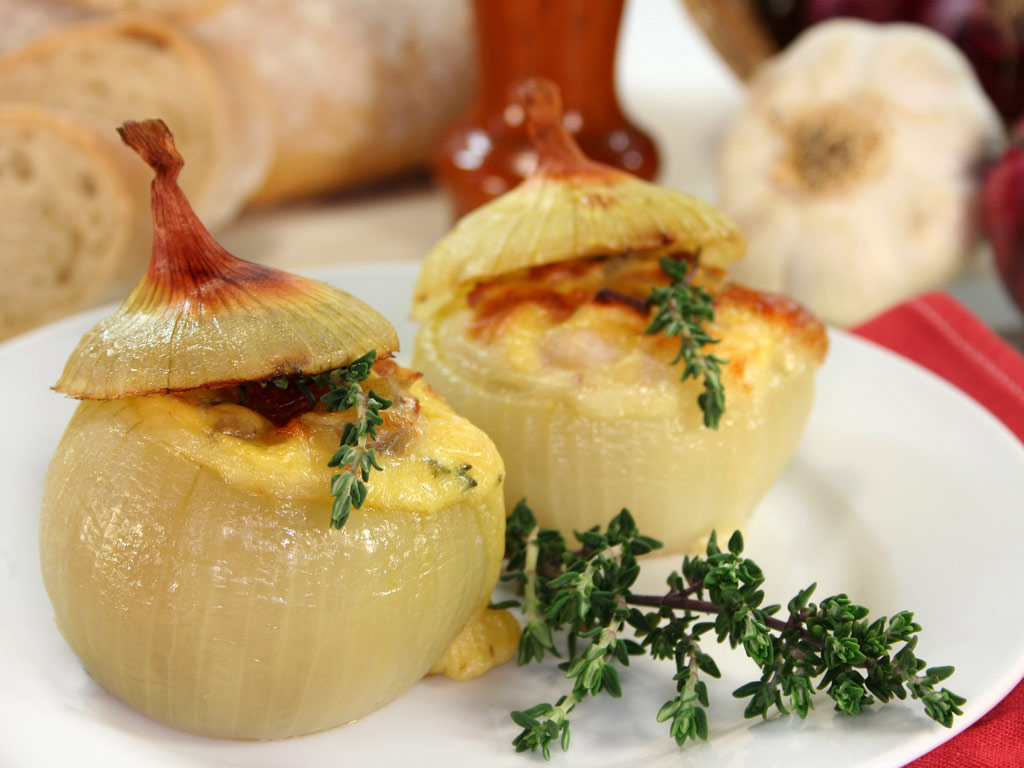 1) Pela y pon a hervir las cebollas, hasta poder atravesarlas fácilmente con un palillo. Luego córtalas en horizontal y vacíalas, conservando la cebolla extraída.