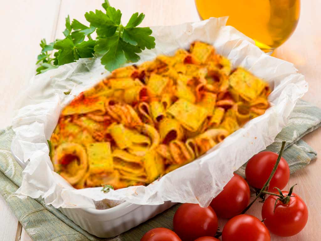 Este plato es típico de la región de Nápoles la Campania en Italia. Es una pasta a base de calamares, el nombre Calamarata deriva del tipo de pasta que se utiliza, que se asemeja a las anillas de calamares.
