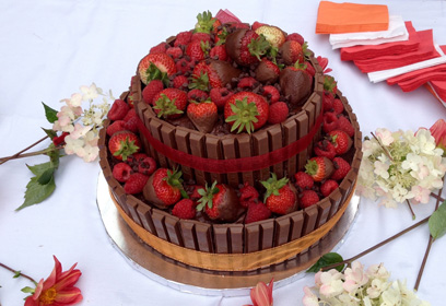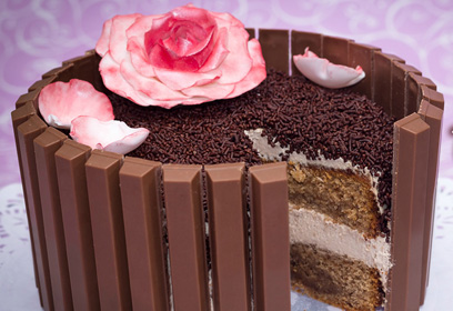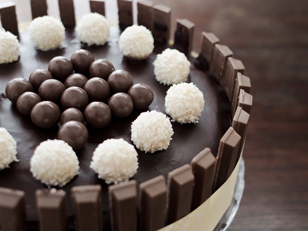 Pasado ese tiempo, aplica una ligera capa de ganache alrededor de la tarta para poder pegar los palitos de kit kat (mejor de dos en dos), colócalos en vertical uno al lado del otro hasta dar la vuelta a la tarta y así recubrir toda la verticalidad de la tarta. Ahora rodea la tarta con el lazo y haz un lazo para sostener los palitos de kit kat, termina haciendo un nudo mariposa. Coloca en el centro de la tarta las bolitas de avellana y chocolate, reserva unas docenas para pringarlas en la ganache y pasarlas por la ralladura de coco, a continuación, repártelas alrededor de la superficie de la tarta (Como se ve en la Foto).