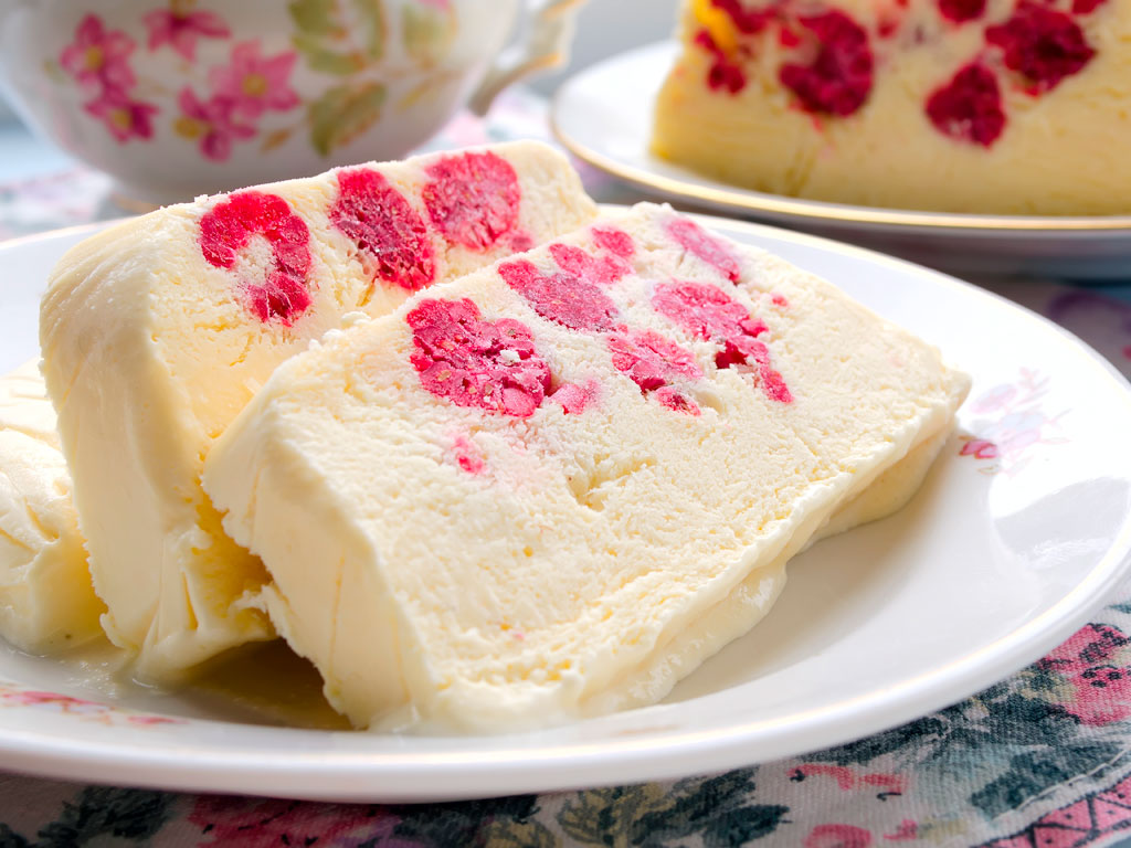 6) Para servirlo saca el molde del congelador, coge los extremos del papel film y saca el semifrío del molde, ahora colócalo encima de una tabla de cortar limpia y corta las porciones deseadas, colócalas en una fuente fría para que las porciones no se derritan y decóralas con el resto de las frambuesas.