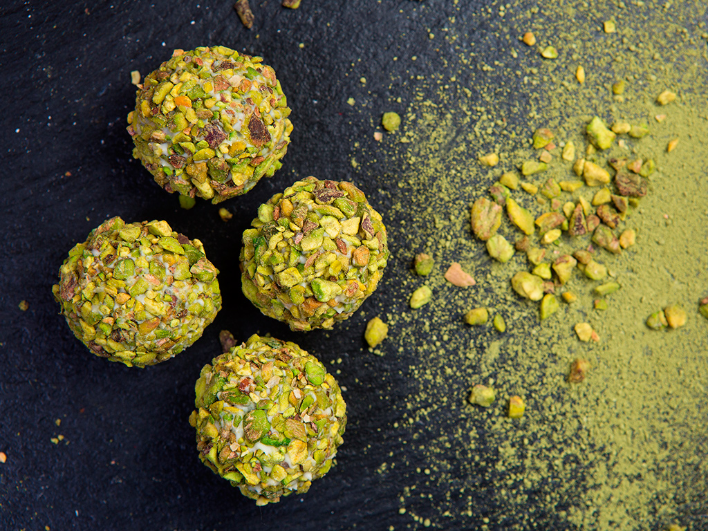 3) Con la ayuda de dos cucharas o con la mano formamos bolas y las pasamos por el pistacho triturado. Las reservamos en la nevera hasta el momento se servir.