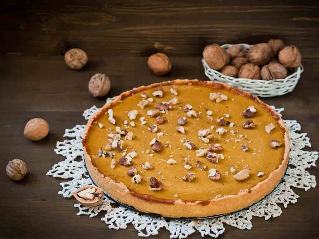 8) Vierte el relleno, decora con las nueces reservadas y vuelve a hornear por otros 20 minutos (Vigila de vez en cuando para que no se queme la tarta (cada horno calienta de forma diferente).