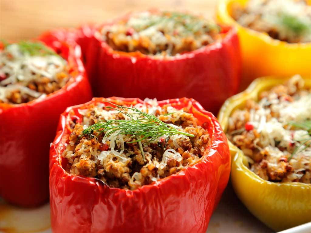 4) A este punto rellena los pimientos utilizando la masa previamente preparada, rellena casi hasta el borde (Deja por lo meno ½ cm. sin rellenar, porque en el horno sube el volumen) y a continuación espolvorea con parmesano.