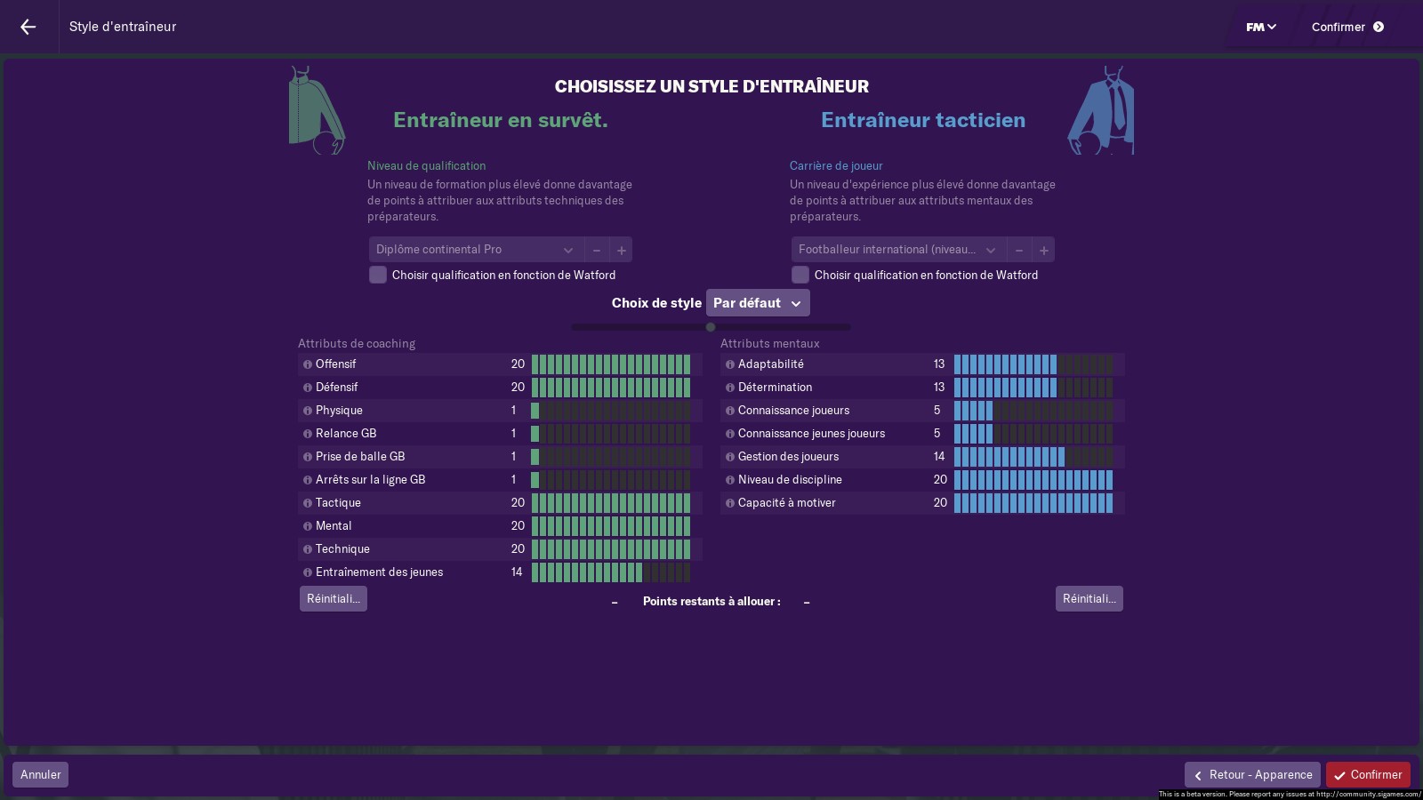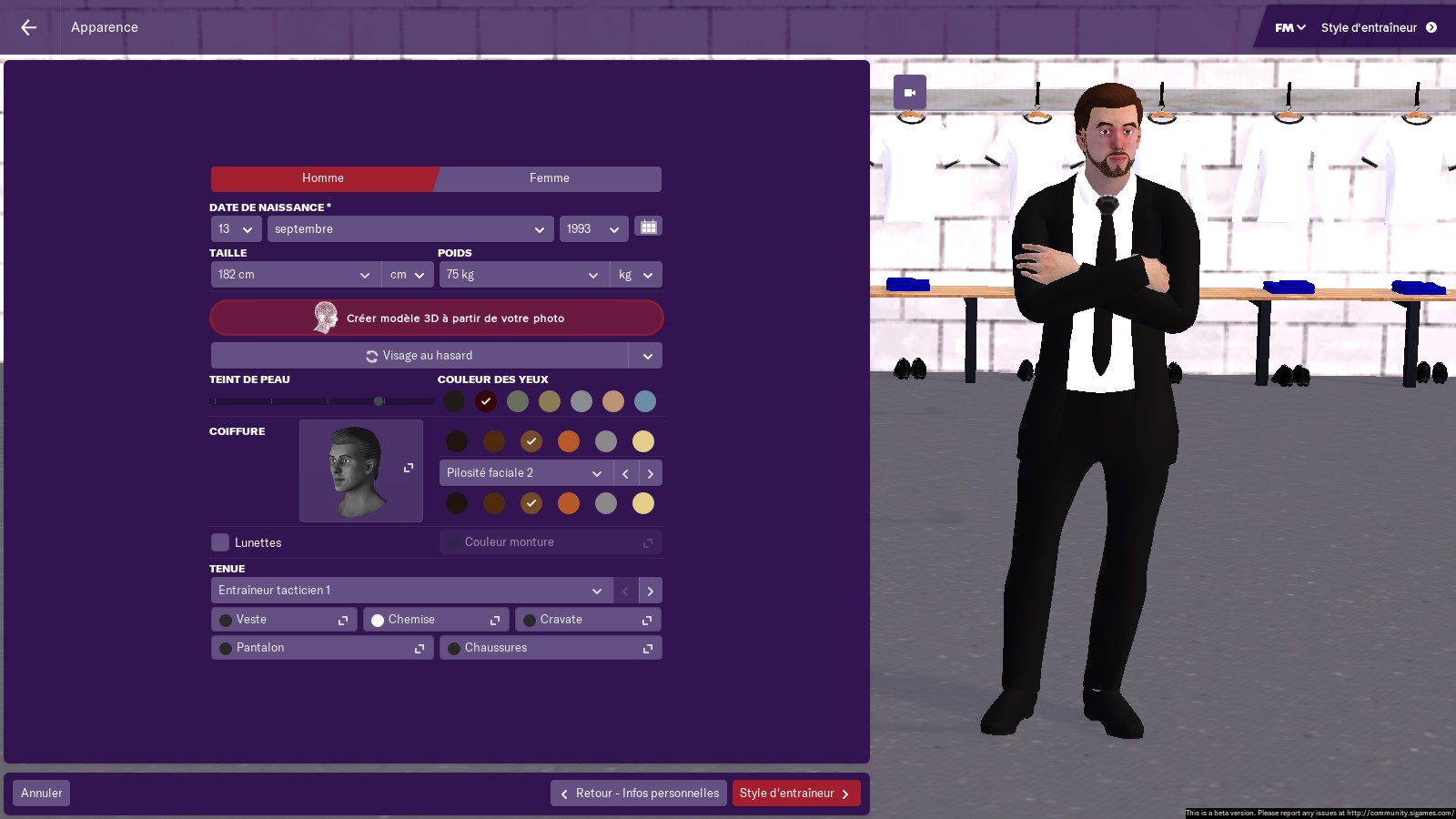 Vous prenez les commandes d’un club de football en tant que manager général. Après avoir choisi votre équipe, vous aurez la possibilité de créer votre entraineur. Vous pouvez le personnaliser :
