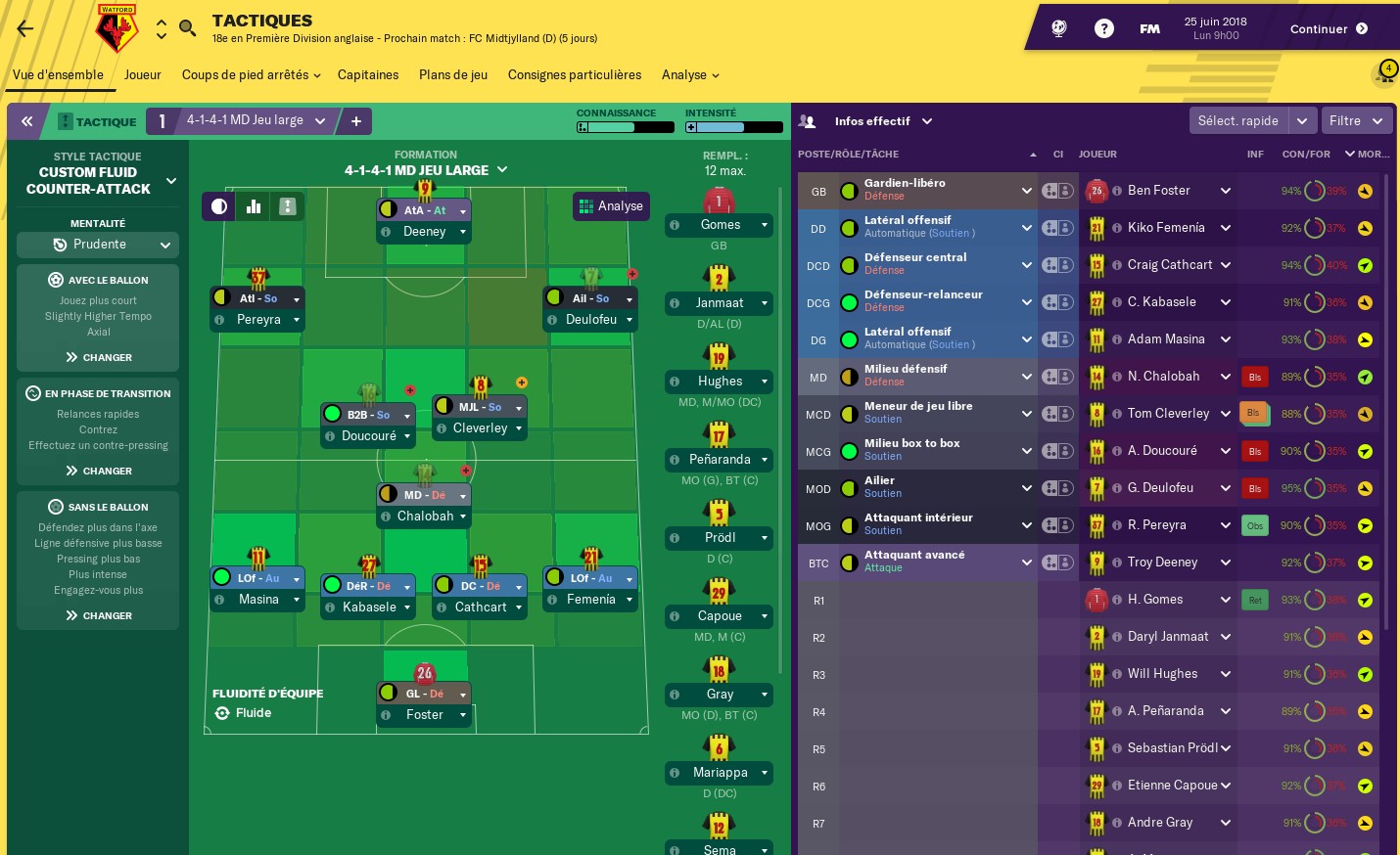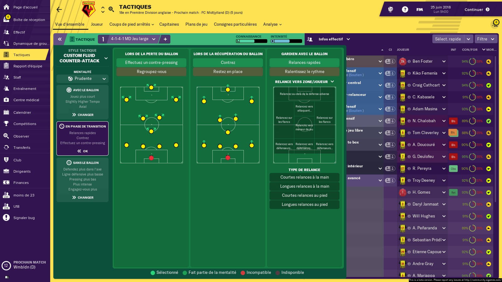 L’une des améliorations les plus importantes dans FM19 est le module tactique. Il est possible de créer simplement une tactique en fonction de la possession de balle de votre équipe (avec ou sans le ballon et en phase de transition)