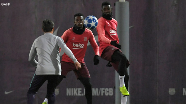 © AFP Lluís Gené Ousmane Dembele (dcha) y Nelson Semedo participan en un ejercicio con balón durante un entrenamiento del FC Barcelona este lunes 10 de diciembre en la ciudad deportiva del club, preparatorio del partido contra el Tottenham Hotspur