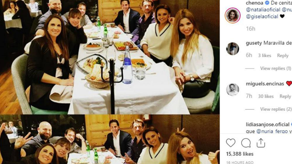 "De cenita, muy agustito con @nataliaoficial, @nuria_fergo y @giselaoficial", reza la breve pero precisa descripción con la que Chenoa resumió una noche tan especial y divertida para las tres intérpretes y sus respectivos compañeros sentimentales. Y es que, además del doctor Sánchez Encinas, en la mesa también se encontraban José Ángel Ortega, novio de Gisela, Álex Pérez, pareja de Natalia, y el actor Enrique Arce, quien a todas luces parece vivir un bonito romance con Nuria.