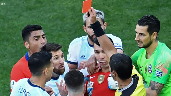 Sao Paulo (AFP) - Tras la victoria 2-1 contra Chile este sábado por el tercer puesto de la Copa América, en que Lionel Messi acabó expulsado por tarjeta roja directa a los 35 minutos tras un forcejeo con Gary Medel, el astro argentino explotó con duras críticas al estamento arbitral y a la Conmebol."Creo que nosotros no tenemos que ser parte de esta corrupción, de esta falta de respeto que se nos hizo en esta Copa", declaró en zona mixta el astro, que no acudió a la ceremonia en la que los argentinos recibieron una medalla por su tercer puesto."Lamentablemente la corrupción, los árbitros y todo eso no permite que la gente disfrute del fútbol, del 'show' y lo arruina un poco", agregó.Sobre su lance con Medel, aseguró que el jugador chileno "siempre va al límite, pero no era roja para ninguno de los dos". "Se podría haber revisado con el VAR (videoarbitraje)", insistió Messsi visiblemente molesto por lo que interpretó como un castigo tras sus críticas después del arbitraje de la semifinal, en la que Brasil derrotó por 2-0 a Argentina."Creo que la expulsión fue por lo que dije.Mis palabras tuvieron repercusiones, pero siempre hay que ser sincero.Soy honesto", denunció Messi al analizar la actuación del árbitro paraguayo Mario Diaz De Vivar."Antes del partido dijo que le gustaba hablar y que ojalá manejáramos un partido tranquilo, y a la primera me expulsa", explicó el goleador del Barcelona."Me voy tranquilo, aunque con bronca por no haber podido acabar el partido.Estábamos bien plantados".El domingo se disputará en Rio de Janeiro la final de la Copa América entre Perú, verdugo de Chile en semifinales, y Brasil."Creo que estábamos para más.Ante Brasil y hoy hicimos nuestro mejor partido.El resultado debería haber sido otro pero no nos dejaron estar en la final", insistió en sus denuncias.- "La Copa está armada para Brasil" -Visiblemente contrariado en la zona de atención a la prensa, Messi no paró allí y denunció que el ganador del torneo continental estaba señalado de antemano."Creo que no hay duda de que Brasil está para salir campeón.La Copa está armada para Brasil y ojalá el VAR y los árbitros no tengan nada que ver en la final y Perú pueda competir, porque tiene equipo para hacerlo, pero lo veo difícil", explotó.Pese al mal trago de la expulsión, Messi destacó el triunfo de la selección albiceleste tras un pésimo arranque de Copa América."Me voy tranquilo y con la cabeza alta.Espero que se respete a este grupo, que lo dio todo y tiene mucho que dar.Encontramos la idea, el juego y fuimos creciendo en el torneo", enumeró. "Demostramos mucha personalidad.No es fácil empezar perdiendo (con Colombia) y empatando luego con Paraguay, no encontrando la dinámica del juego...pero el grupo ese hizo más fuerte que nunca y acabamos de manera muy positiva".Messi también aprovechó para dar un voto de confianza al actual seleccionador, Lionel Scaloni."Scaloni fue creciendo a la par que el grupo, encontramos una idea de juego.Estamos contentos de cómo terminamos ante selecciones muy competitivas.Ojalá no se rompa.Hicimos una buena Copa de menos a más.Que el técnico se quede seis meses más da tranquilidad y es bueno para seguir creciendo", zanjó el rosarino.