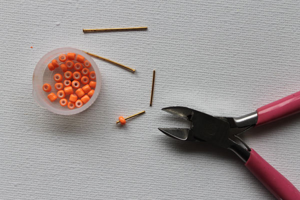 Prenez une épingle à tête et enfiler une seule perle de graine. Vous aurez besoin d'environ 1 cm de longueur après la perle pour faire une boucle, et coupez toute longueur restante.