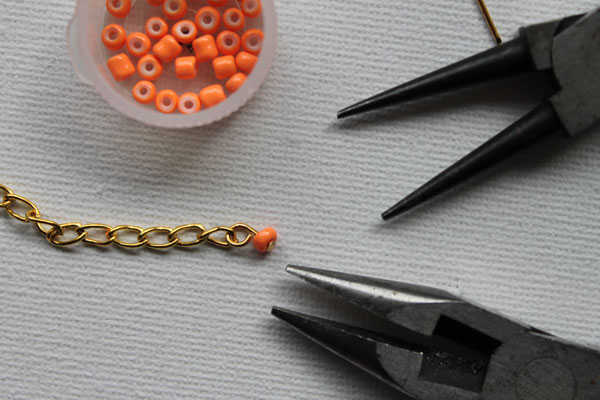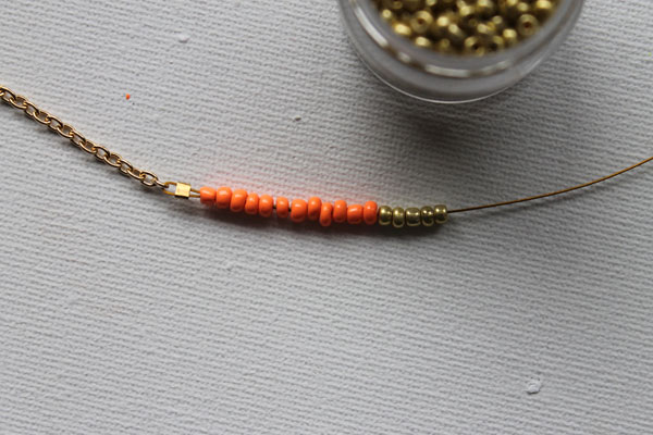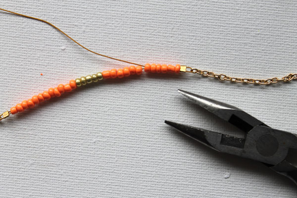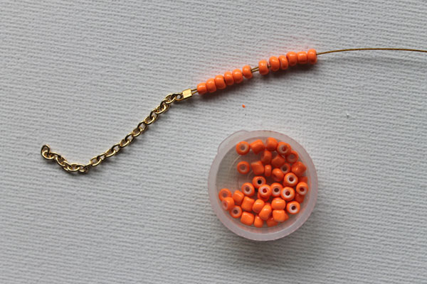 Enfilez 12 perles de couleur sur la queue du tigre. Nous avons utilisé toutes les perles oranges pour un effet graphique de blocage des couleurs.