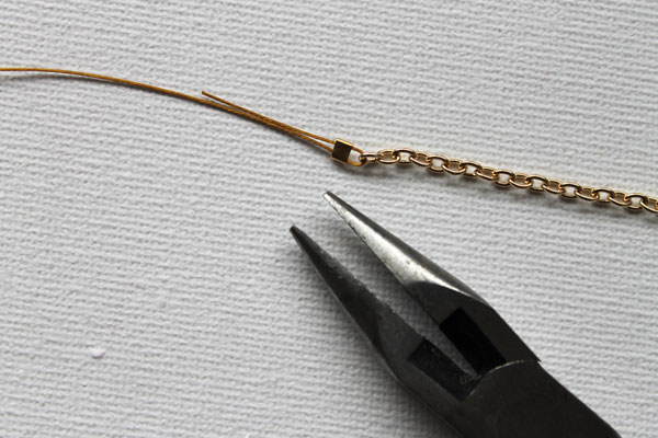Prenez un deuxième morceau de petite chaîne, passez la queue du tigre dans le maillon d'extrémité et faites une boucle dans la sertissure et les cinq ou six dernières perles à l'extrémité.