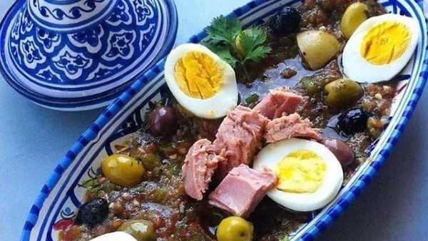 -Dresser dans un plat de service et décorer de thon, d'olives et d'oeuf dur.