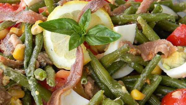 -Coupez les tomates et les oeufs en morceaux, déposez-les dans un grand saladier, ajoutez les haricots verts, le maïs, le thon égoutté et émietté ainsi que les filets d'anchois, pensez à bien les rincer s'ils sont au sel.