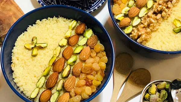 Poser une couche de mesfouf dans des verrines, puis une couche de crème, recouvrir d’une autre couche de mesfouf.