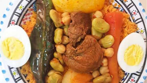 -Mettre la semoule (le couscous) dans un grand saladier, ajouter une demi-cuillère à café de sel et 5 cuillères à soupe d'huile. Frotter le couscous entre les mains jusqu'à ce qu'il n'y ait plus de graines collées. Déposer dans le couscoussier (keskés)