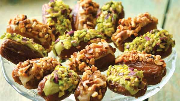 Disposer chaque datte farcie sur un plateau et décorer avec les fruits secs