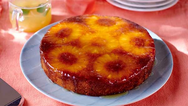 Verser le caramel dans un moule et ajouter au-dessus les rondelles d’ananas