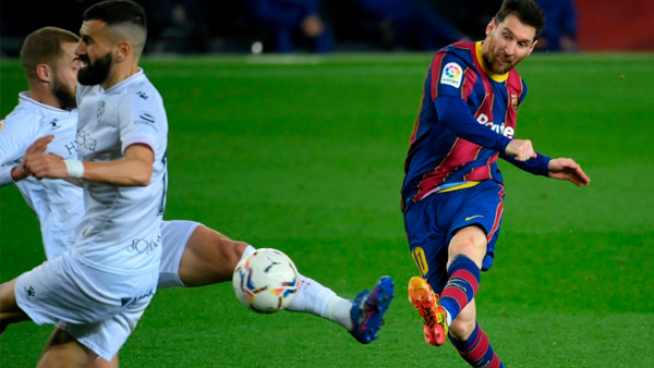 Sin embargo fue el Huesca el que, en una de sus escasas incorporaciones al ataque sacó un penal, en un derribo de Marc André Ter Stegen a Rafa Mir que el delantero oscense convirtió en el 2-1 provisional (45+4.) El Barça no quería sorpresas y al poco de la reanudación anotó el tercero, en un centro de Messi que cabeceó a la red Mingueza (53).Rafa Mir tuvo la ocasión poco después de volver a meter al Huesca en el partido, en un remate que parecía claro pero que se le fue desviado al tratar de empujar la pelota con el pecho en lugar de la cabeza (57).Eso acabó con la resistencia del Huesca, que aún acabaría encajando un cuarto tanto, obra otra vez de Messi y de nuevo con un tanto marca de la casa: recibió la pelota escorado a la derecha en zona de tres cuartos, avanzó unos metros centrando su posición y antes de pisar el área soltó un zurdazo pegado a la base del palo (90)Con este doblete, el argentino suma 21 goles en el campeonato y se afianza al frente de la clasificación del Pichichi, con tres tantos de ventaja sobre el uruguayo Luis Suárez.