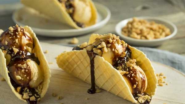 Déposez 3 boules de glace à la vanille et décorez de coulis et de noix à votre convenance
