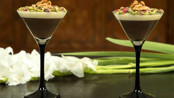 Ajouter de la crème dans chaque coupe, en deuxième couche. Laisser refroidir et décorer avec des fruits secs.