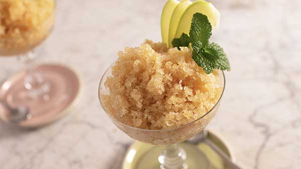 Au moment de servir, grattez la glace et servez avec quelques morceaux de pommes et un brin de menthe.