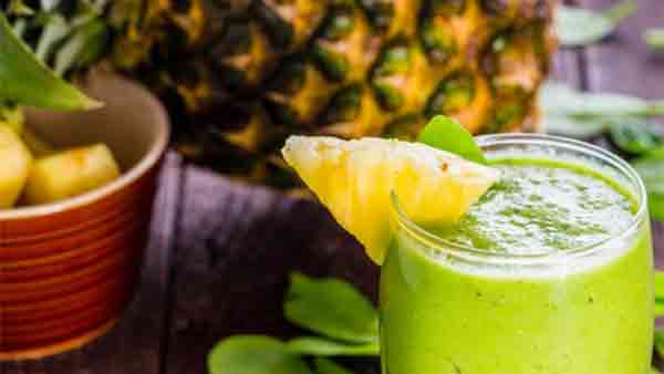 Enlevez la peau de l'ananas et la partie dure au cœur, puis coupez-le en morceaux. Lavez les feuilles d'épinards. Lavez également le concombre puis coupez-le grossièrement. Lavez les branches de céleri et coupez-les en tronçon. Coupez le citron vert en deux puis pressez-le pour en extraire le jus. Réservez-le dans un bol.