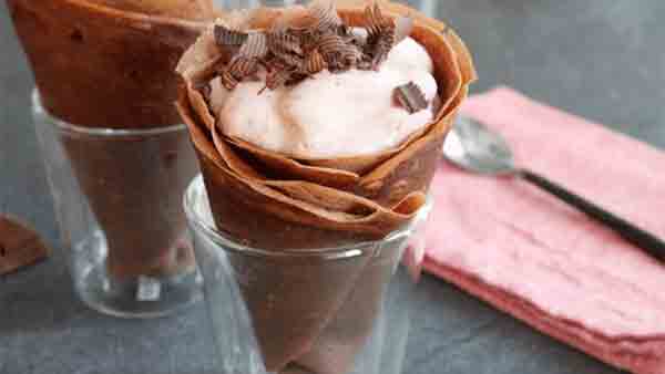 Pliez les crêpes en deux et roulez-les en cornet. Déposez-les dans des verres. Garnissez-les de dés de poires, puis de chantilly et de noix !