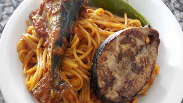 chauffer un fond d'huile à feu vif au fond d'une marmite. Ajouter le concentré de tomates, le piment moulu, ½ cs de sel et 1 cc de poivre noir. Faire revenir pendant une minute, puis ajouter un bol d'eau bien chaude. Ajouter les pois chiches et le laurier, et laisser cuire 2-3 minutes. Ajouter l'ail écrasé, le poisson coupé en morceaux et les piments coupés en 2. Terminer la cuisson pendant 10 minutes environ, la sauce doit être bien épaisse. Si elle est trop liquide, retirer le poisson et les légumes et laisser la sauce réduire. Si elle est trop épaisse, corriger avec un peu d'eau. Entre-temps, cuire 500g de macaroni dans de l'eau salée, ainsi que les œufs. Dans le plat de service, mélanger les pâtes avec la sauce, puis garnir avec le poisson, les légumes et les oeufs durs à votre convenance. Servir chaud.