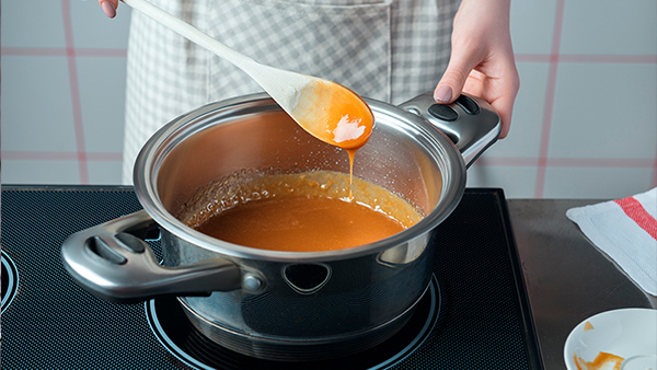 Al añadir este segundo ingrediente, se producirá un efecto de efervescencia y el caramelo se llenará de burbujas. Removeremos la mezcla con cuidado hasta que veamos que tiene una textura espumosa.