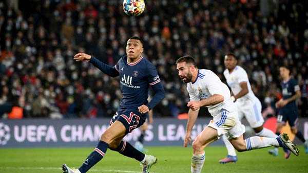 El delantero del Paris Saint-Germain Kylian Mbappé (izq.) pelea por el balón con el defensa del Real Madrid Dani Carvajal en un partido de la Liga de Campeones el 15 de febrero de 2022 en París.