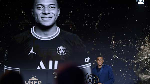 El delantero del Paris Saint-Germain Kylian Mbappé recibe el premio de Mejor Jugador de la Liga 1 francesa el 15 de mayo de 2022 en París.