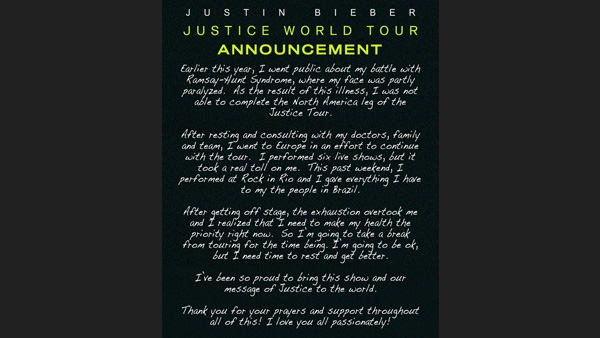 Anteriormente el intérprete de “Baby” anunció que fue diagnosticado con el síndrome de Ramsay Hunt, motivo que lo ha llevado a tomar la drástica decisión.