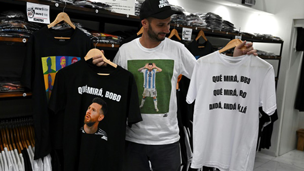 El orgullo de los hinchas argentinos por ver al fin a Lionel Messi en modo de líder carismático desató furor comercial por venta de productos con una frase pendenciera suya tras vencer a Países Bajos (4-3 en penales) en cuartos de final del Mundial de Catar-2022."¿Qué mirás, bobo? Andá payá", le disparó al capitán albiceleste a Wout Weghorst, autor de los goles para el empate (2-2) en los tiempos reglamentario y suplementario, en definición para el infarto. El neerlandés se le acercaba, no se sabe bien para qué, y Messi era entrevistado en la TV para millones de aficionados de todo el mundo.Estaba muy enfadado aún por las rencillas entre jugadores y su encono por lo que interpretó como falta de respeto del DT Louis Van Gaal."Me pareció genial la frase.Tan inocente, tan tierna comparada con la del mundo del deporte.Él es supereducado.Les compré con la leyenda remeras a mis tres nietos varones, locos por el Mundial", dijo a la AFP Graciela Squietino, jubilada de 67 años.