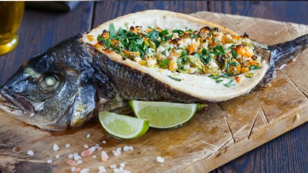 -Ouvrez la dorade et farcissez-la. Pour refermer la dorade, utilisez des petits piques en bois afin de la " recoudre ".