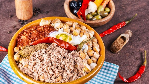 -Emiettez le pain dans un bol suivant votre appétit, mettez-y les pois chiches cuits et garnissez d'harissa, jus de citron, cumin, ail haché, huile d'olive, un oeuf, du thon, des olives et des câpres.