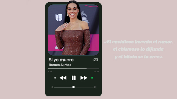 La también diseñadora ha compartido con sus fans una foto en la que aparece una resplandeciente luna y también las letras del tema 'Si yo muero', de Romeo Santos. De sus versos, Georgina rescata una frase demoledora que sirve de mensaje tanto para sus críticos como para quienes hayan dado credibilidad a esas supuestas invenciones. "El envidioso inventa el rumor, el chismoso lo difunde y el idiota se lo cree", ha incorporado a su publicación.